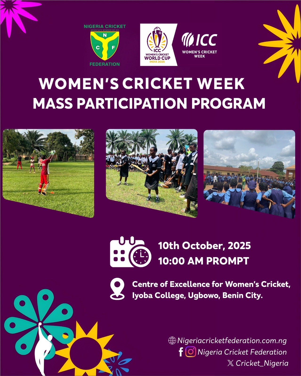 All is now set for the commencement of the 5th edition of the Edo Female Cricket League and celebration of the 2025 International Cricket Council (ICC) Women’s Week in Benin as the Women’s Legacy and Mass Participation Programme have been designed to mark the Women’s week.