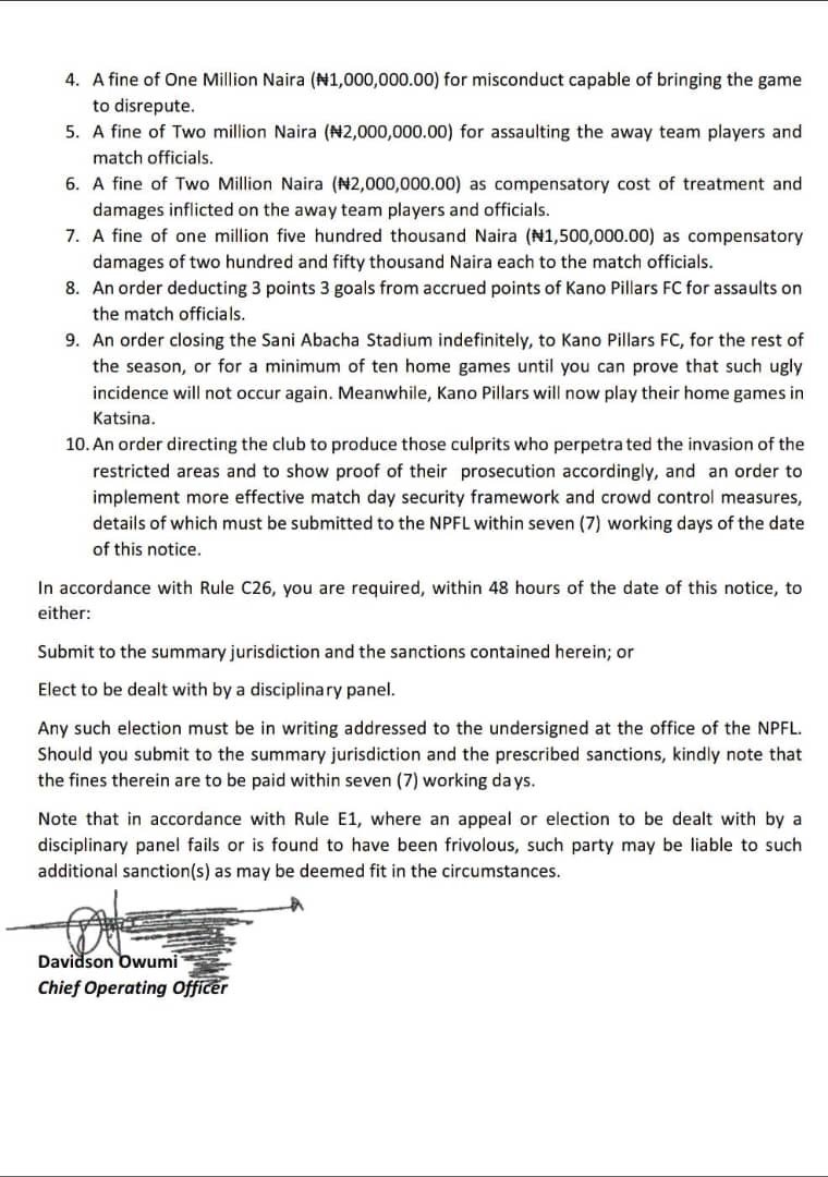 Kano Pillars reserves the right to appeal these decisions and could attract additional sanctions should the appeal fail.