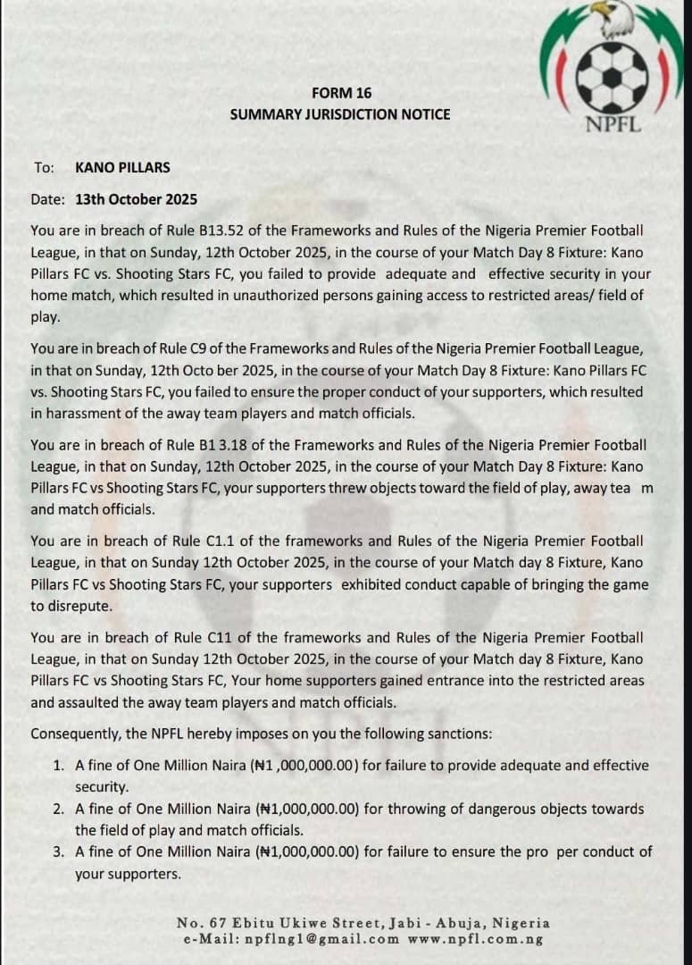 The NPFL cited Kano Pillars supporters for acts that brought the league to disrepute in breach of Rule C1.1 and was fined N1m. Another N2m was imposed as fine for assault on the away team and match officials.